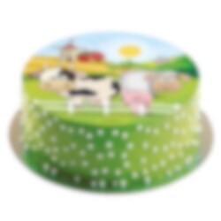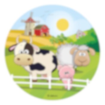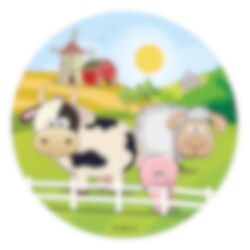 Kakebilde av oblat med motiver av søte husdyr på gården sin. Bak din egen kake til barnefesten med et gårdstema og legg oblatet din på toppen. Bildet, som er 20 cm i diameter, er enkelt å bruke. Kakebildet er glutenfrie og laktosefrie og har ikke tilsatt sukker.