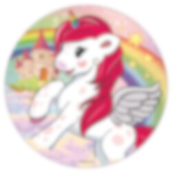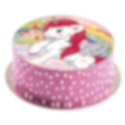 Vakkert kakebilde av en god, sukkerfri pasta med en søtt enhjørningsmotiv. Kakebildet er klart til å legges rett på kaken, og har et tydeligere og mer detaljert trykk enn hva et oblatpapir har. Bildet er ca. 16 cm i diameter.