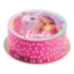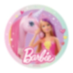 Kakebilde av oblat med motiver av Barbie sammen med en vakker enhjørning. Bak din egen kake til barneselskapet med Barbie-tema og legg oblaten på toppen. Bildet, som er 20 cm i diameter, er enkelt å bruke. Kakebilder av oblat er gluten- og laktosefrie og uten tilsatt sukker.
