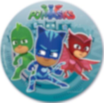 Kakebilde av oblatpapir med søte motiver fra Pysjheltene. Bildet som er ca 20 cm i diameter er enkelt å bruke. Bilder av oblat er glutenfri og laktosfri og har ingen tilsatt sukker.