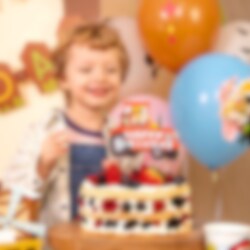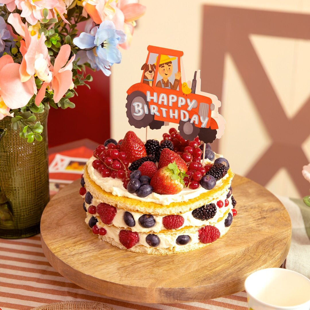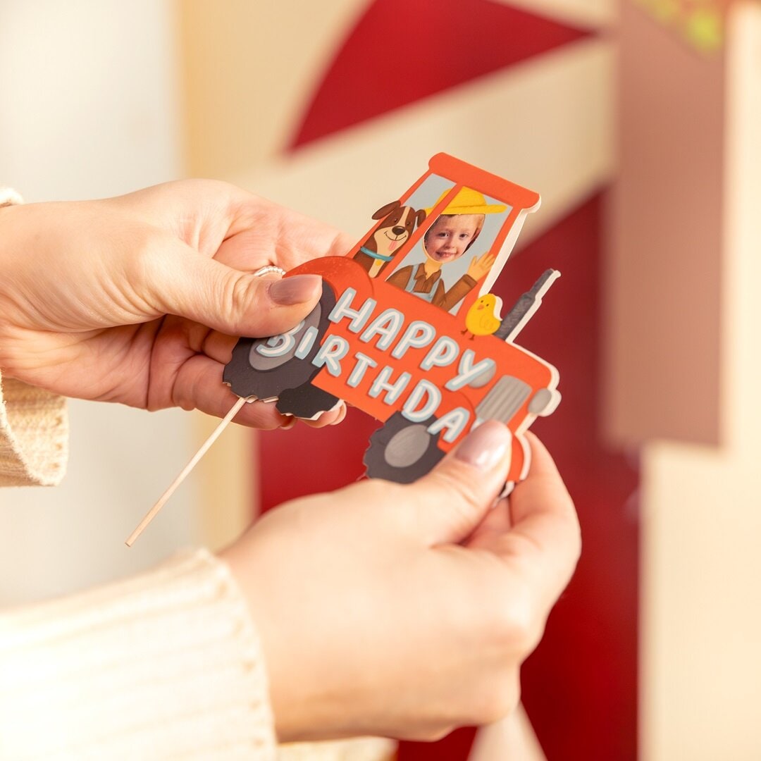 Kakedekorasjon formet som en traktor som blir en morsom og personlig detalj på kaken til barnebursdagen. Dekorasjonen har teksten Happy Birthday og en smart åpning der du kan sette inn et eget bilde, noe som gjør den ekstra fin til en bursdag med gårdstema.