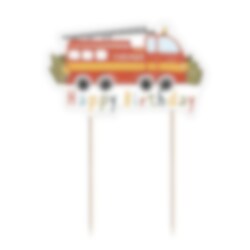 Cake topper som har motiv av brannbil og teksten "Happy Birthday" i muntre farger. Høyde 19 cm.