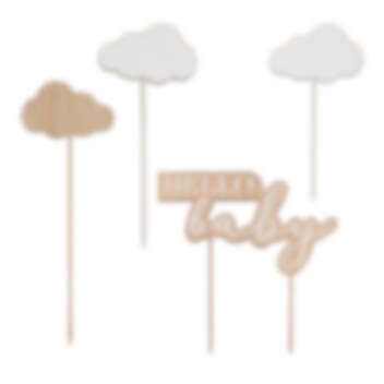 4 stk. cake toppers i tre med forskjellige søte Hello Baby-motiver. Perfekt å pynte kaken med når det er tid for babyshower-fest. De er mellom 6 og 12 cm høye.