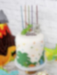 Dinosauren er cirka 9 cm høy og teksten er cirka 6 x 3 cm med en rødskimrende overflate. Laget av holdbar plast, som gjør den gjenbrukbar og enkel å plassere på kaken.