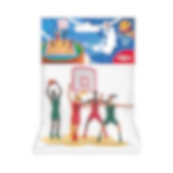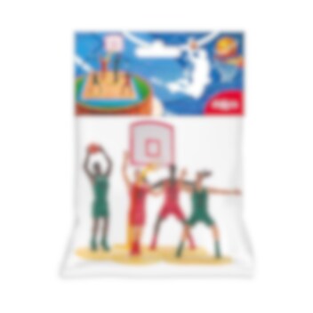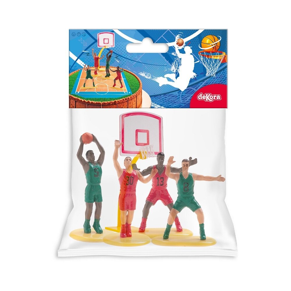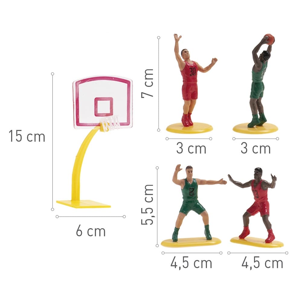 Settet inneholder en basketballkurv og fire basketballspillere i ulike posisjoner som plasseres direkte oppå kaken. Basketballkurven er cirka 15 cm høy og spillerne er omtrent 5,5-7 cm høye, noe som gjør dem til et skikkelig blikkfang på kaken. Perfekt til et sportsbursdag, et basketballbursdag eller for alle som elsker basketball.