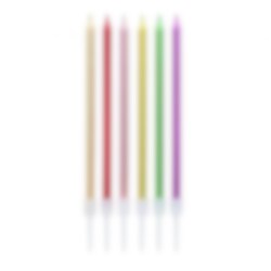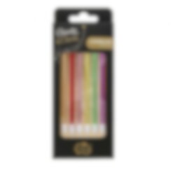 Disse kakelys i fine metalliske farger er det perfekte tillegget til enhver festlig kake. Hver pakke inkluderer 6 kakelys som har en høyde på 13,5 cm, og det ingår også 6 holdere for enkel bruk.