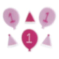 6 stk. sukkerdekorasjoner som forestiller ballonger og hatter i rosa nyanser med motiv av sifferet "1". Utmerket å ha på kaken til 1-årsfesten.