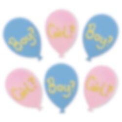 6 stk.sukkerdekorasjoner i fine pastellfarger med teksten "Boy?" og "Girl?" i gull. Dekorer disse på kaken eller bakverket når det er tid for en Gender Reveal fest.