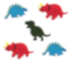 5 stk. sukkerdekorasjoner som representerer dinosaurer. Pynt muffinsene eller kaken med disse når det er fest.