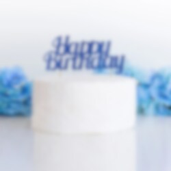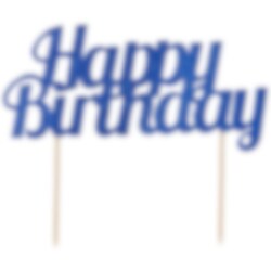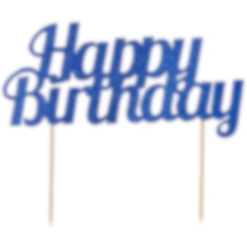 Kakedekorasjon med teksten "Happy Birthday" i glitrende blå. Dekorer kaken med denne når det dukes til bursdagsfest for å gjøre kaken ekstra stilig. Pynten er ca. 10 x 14 cm stor.