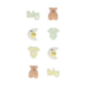Settet inneholder 8 dekorasjoner: 2 bamser, 2 babybodyer, 2 måner og 2 med babytekst. Figurene er ca. 2 cm i diameter og laget av 96 % sukker. Produktet er glutenfritt (sertifisert NL-090-131) og inneholder eggehvite. Oppbevares kjølig og tørt, 12-20 °C, beskyttet mot sollys og sterke lukter.