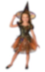 Vakker glitrende kjole i typiske fine Halloween farger med siden og blonder detaljer samt en stilig og fargerik hatt. Kostymen er laget av 100% polyester. Håndvaskes med litt vann. Sko er ikke inkludert.