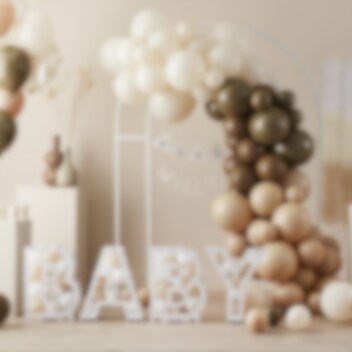 Luksuriøs ballongbue i brune og nøytrale toner som du bygger selv. En virkelig imponerende dekorasjon som passer til både fest, feiring eller babyshower. Pakken inneholder hele 70 stk. ballonger i forskjellige størrelser og tilbehør. Ballongbuen er ca. 5 meter lang.