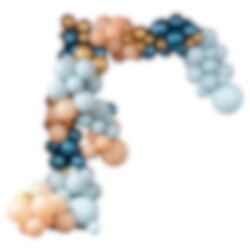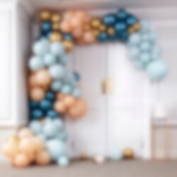 Flott ballongbue i blågrønn, fersken og gull chrome, som du selv bygger sammen. En virkelig imponerende dekorasjon som passer både til selskap, fester eller bryllup. Pakken inneholder hele 200 stk. ballonger i forskjellige størrelser, i tillegg til tilbehør. Ballongbuen er ca. 12 meter lang.