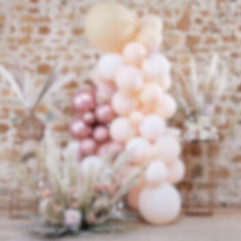Nydelig ballongbue i hvit-, fersken- og rosegullfargede toner som du selv setter sammen. En imponerende dekorasjon som passer til både fest, feiring og bryllup. Pakken inneholder hele 70 stk. ballonger i forskjellige størrelser og tilbehør. Ballongbuen er ca. 4 meter lang.