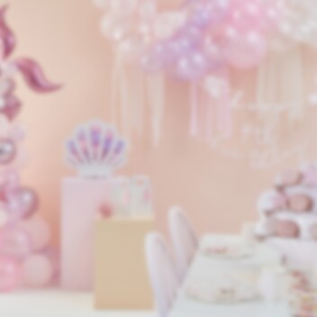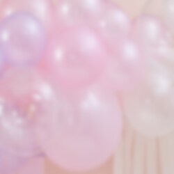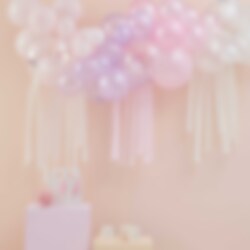 47 stk. ballonger i fargene perle, lilla perle, hvit perle og rosa i størrelsene 12, 25, 30 og 45 cm, 3 stk. transparente orbz ballonger 45 cm, 60 meter papirslynge i fargene rosa, kremhvit og hvit, 3 meter ballongkransbånd av papir, 60 stk. "Limprikker" og 3 meter hvit snor.