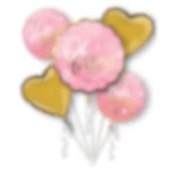 Nydelig ballongbukett i fargene rosa, gullfolie og hvit. En bedårende dekorasjon å ha med på babyshower. Ballongbuketten inneholder 5 stk. ballonger, hvorav 2 stk er hjerteformede gullfolierte ballonger (43 cm), 2 stk runde rosa ballonger med teksten "Hello World!" i hvitt og gullfolie (43 cm) og en blomsterformet folieballong med gullfolierte kanter og med motiv av teksten "Oh Baby!" i hvitt og gullfolie foran en rosa bakgrunn (55 cm)