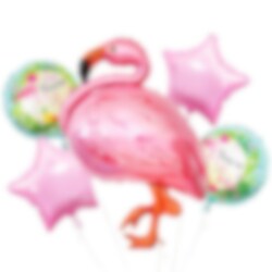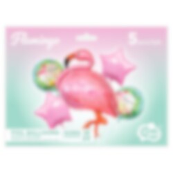 Vakker ballongbukett med forskjellige folieballonger i Flamingo-tema. Buketten består av en stor flamingoballong, 55 cm, to runde ballonger med motiver av flamingoer, 35 cm og to stjerneformede rosa ballonger, 35 cm. I tillegg til ballongene følger det også med en hvit ballongsnor.