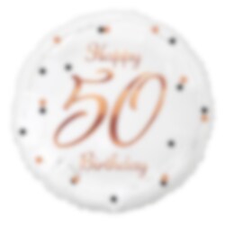 Flott folieballong i hvit med trykt motiv i svart og roségull med tallet 50 i midten. Ballongen blir en vakker dekorasjon til 50-årsfesten. Tilføy gjerne flere ballonger, så blir det en flott samling. Folieballongen har en selvlukkende ventil og fylles enkelt med en ballongpumpe. Man kan også bruke helium dersom man ønsker at ballongen skal sveve. Da anbefaler vi at man også kjøper en ballongvekt og ballongsnor.