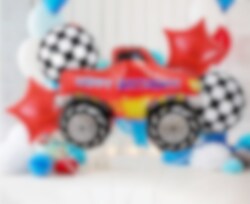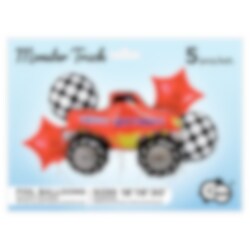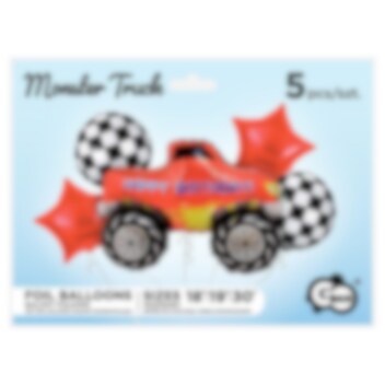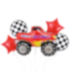 Stilig ballongbukett med forskjellige folieballonger i Monstertruck-tema. Buketten består av en stor Monstertruck med teksten "Happy Birthday", 75 cm, to runde ballonger med rutemønster i hvit og svart, 35 cm og to stjerneformede røde ballonger, 35 cm. I tillegg til ballongene følger det også med en hvit ballongsnor.