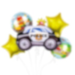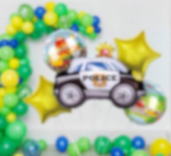 Morsom ballongbukett med forskjellige folieballonger i polititema. Buketten består av en stor politibil, 70 cm, to runde ballonger med motiver av kjøretøy, 35 cm og to stjerneformede ballonger i gull, 35 cm. I tillegg til ballongene følger det også med en hvit ballongsnor.