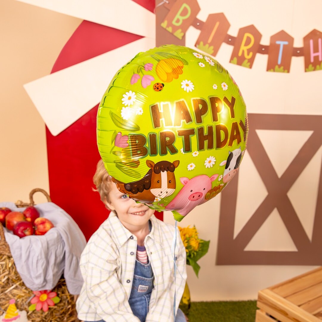 Skap en leken og festlig stemning til barnebursdagen med denne runde folieballongen i gårdstema. Ballongen er prydet med hest, gris og ku sammen med blomster og teksten Happy Birthday, noe som gjør den til en fin dekorasjon for en bursdag med gårdstema.