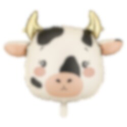 En søt ku-ansiktsballong med svarte flekker, rosa kinn og skinnende gullhorn - et morsomt innslag til gårdsfeiring eller safaritema.