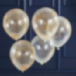 5 stk. transparente ballonger som er fylt med hårlignende konfetti i gull fra kolleksjonen Pop The Bubbly. En vakker dekorasjon å ha med til enhver fest. Ballongene blir ca. 30 cm i diameter når de er oppblåste og kan blåses opp med vanlig luft eller helium. Gni ballongen mot noe tøystoff for å oppnå statisk elektrisitet, på denne måten fester konfettien seg på innsiden av ballongen.