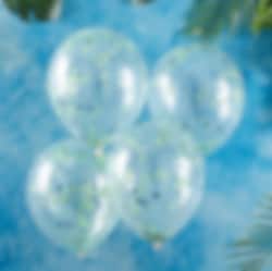 5 stk. ballonger fylt med grønn og blå konfetti. En kul dekorasjon til hver bursdag. Ballongene blir ca. 30 cm i diameter når de er oppblåste.
