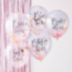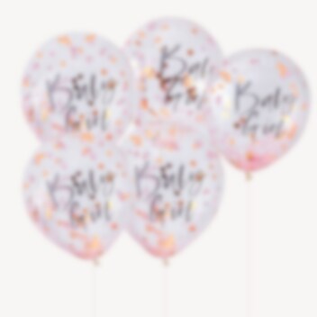 5 stk. ballonger med den utvendige teksten "Baby Girl" som er fylt med konfetti i rosa og roségull. En herlig dekorasjon til din Babyshower. Ballongene blir ca. 25 cm i diameter oppblåste.