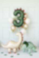 Skap wow-effekt med en stor dinosaurballong formet som tallet 3. Den mørkegrønne fargen med dekorative pigger i oransje/bronse gjør den perfekt til et dinosaurselskap.