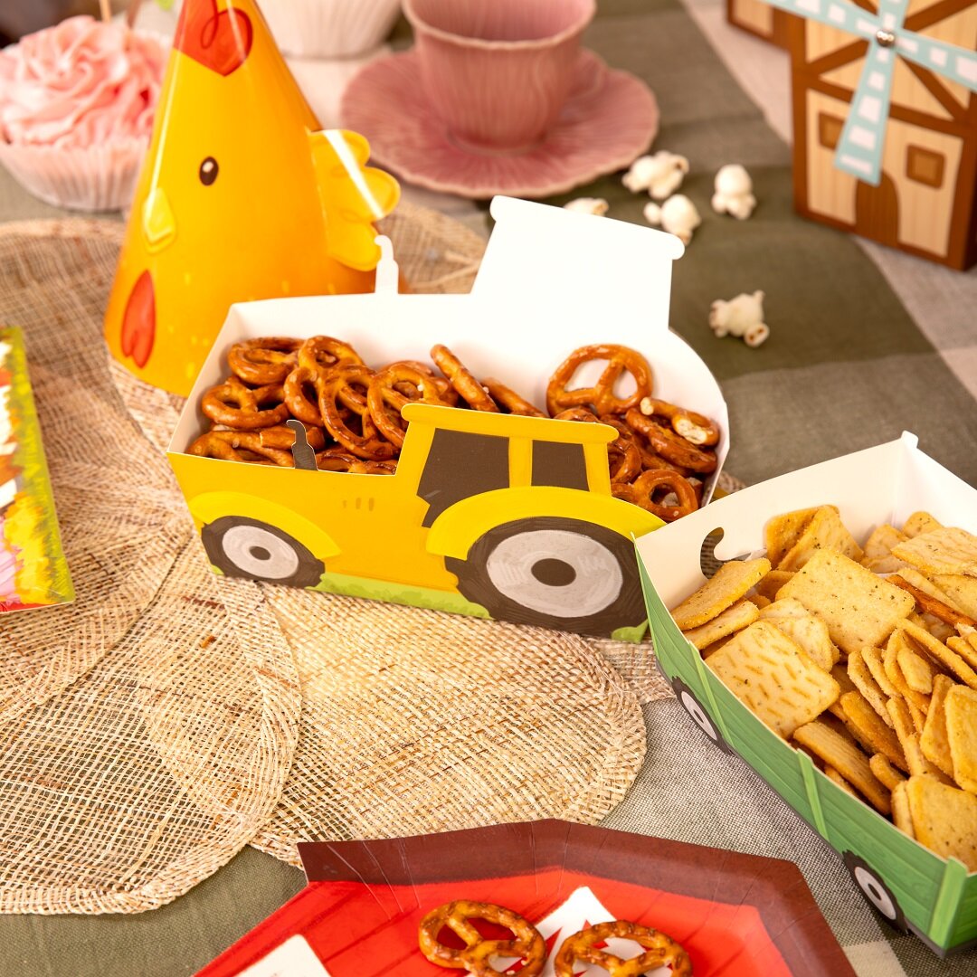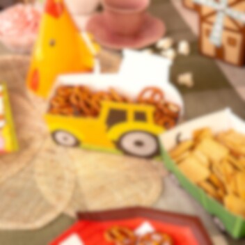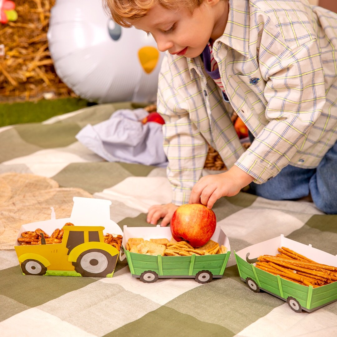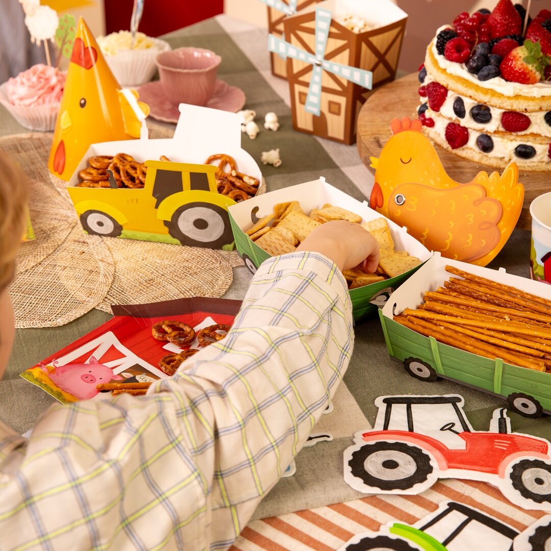 3 snacksbokser formet som en traktor med tilhørende vogner som blir en leken og iøynefallende detalj på bursdagsbordet. De passer perfekt til en barnebursdag med gårdstema og gjør serveringen ekstra morsom for små gjester.