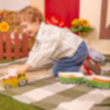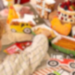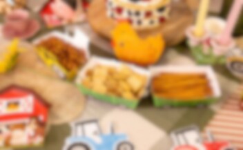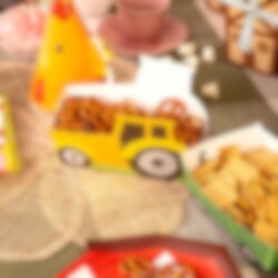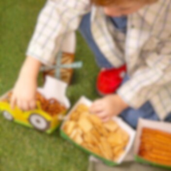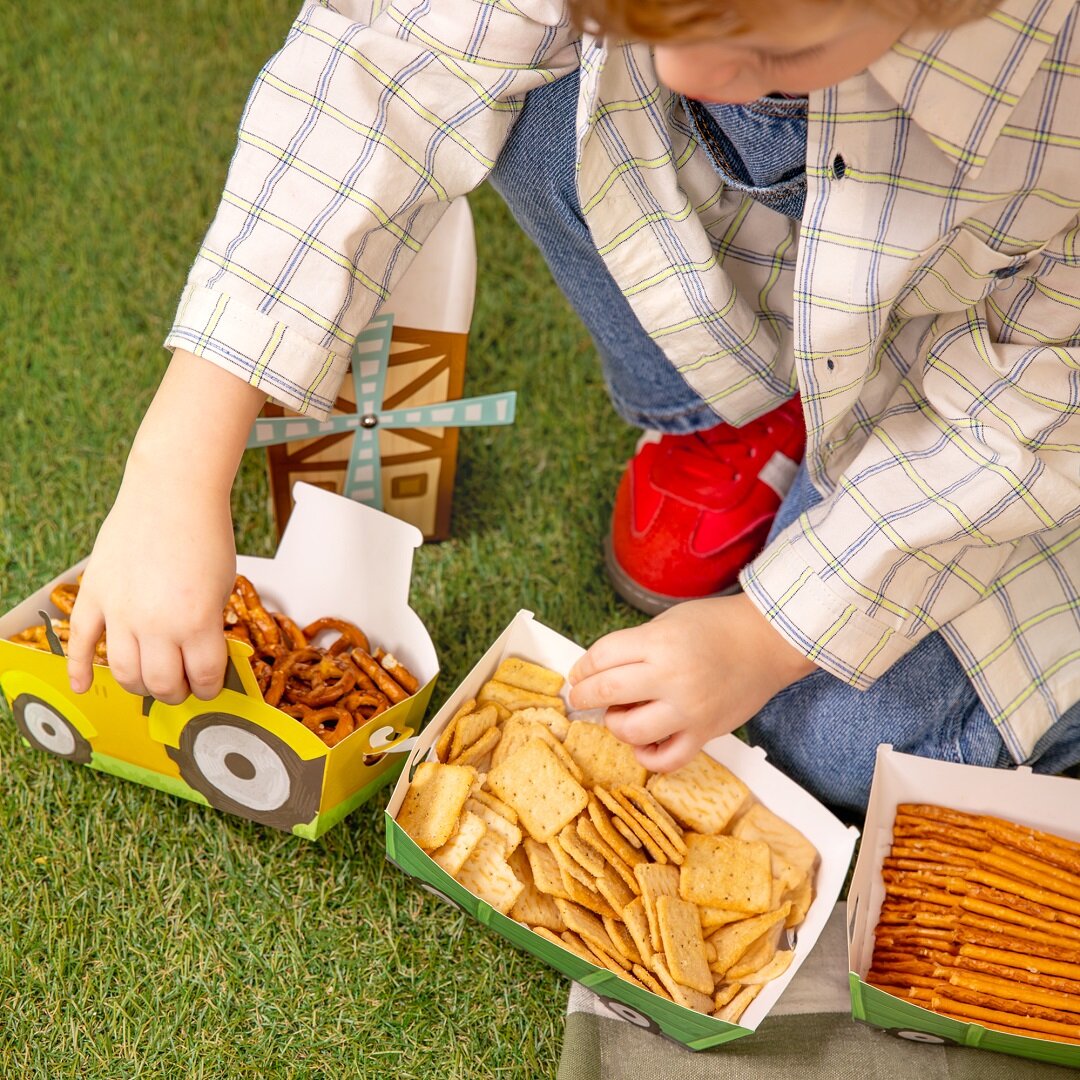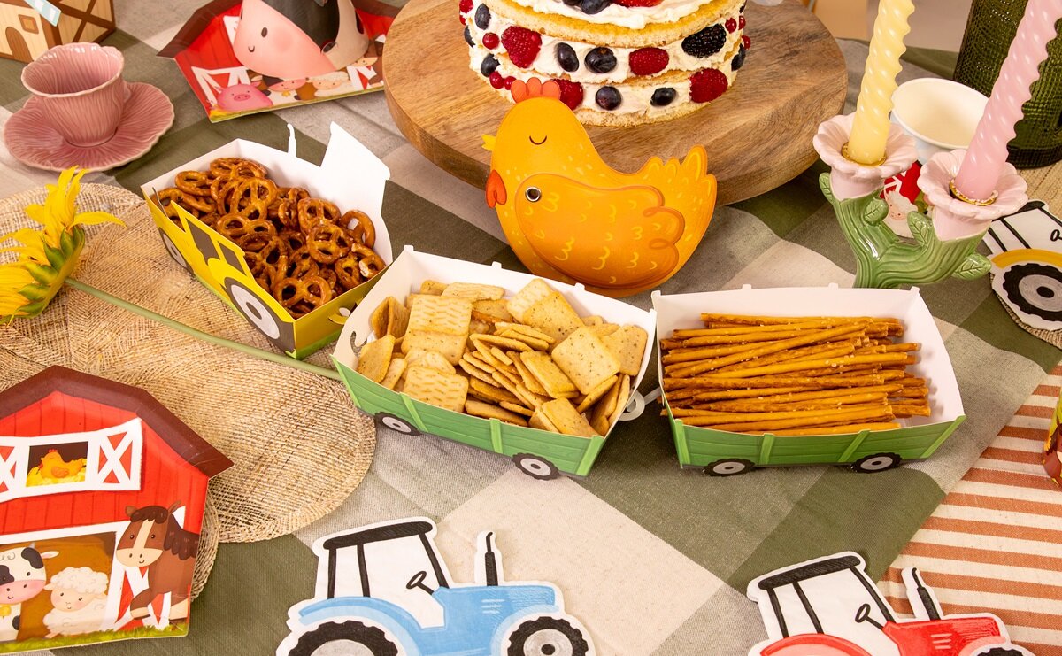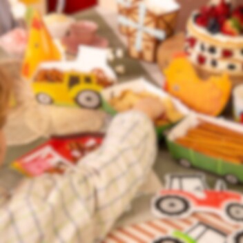 3 snacksbokser formet som en traktor med tilhørende vogner som blir en leken og iøynefallende detalj på bursdagsbordet. De passer perfekt til en barnebursdag med gårdstema og gjør serveringen ekstra morsom for små gjester.