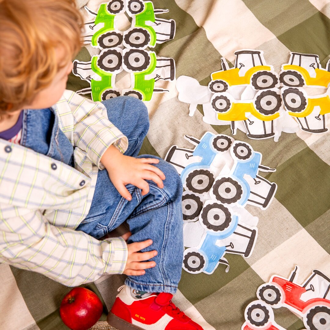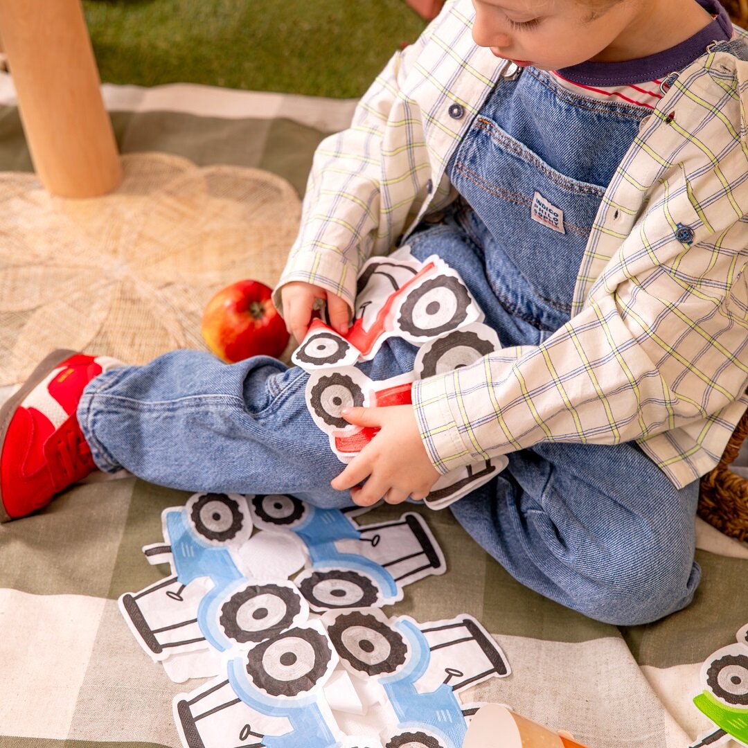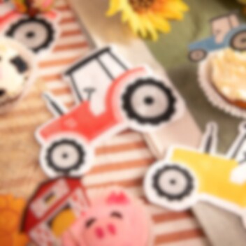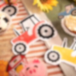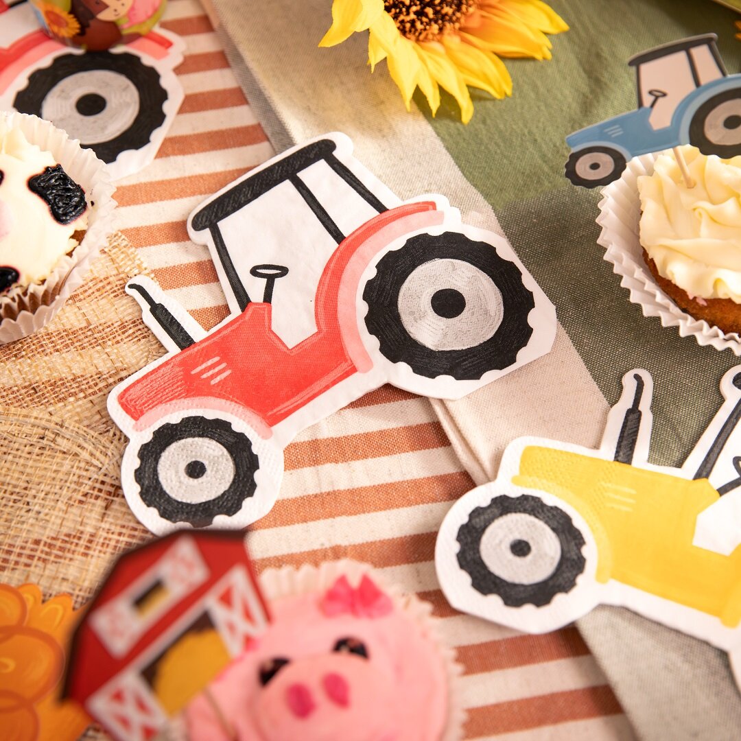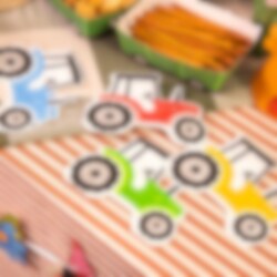 12 servietter formet som små traktorer som blir en leken og sjarmerende detalj på dekkingen til bursdagsselskapet. De fargerike traktorene i grønt, blått, rødt og gult passer perfekt til en bursdag med bondegårdstema og gjør bordet ekstra festlig.