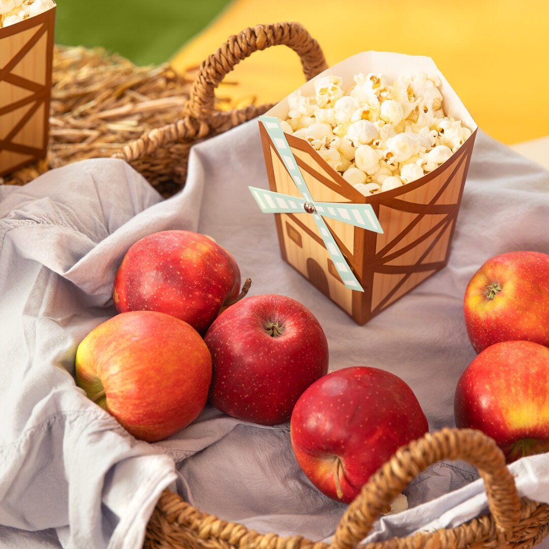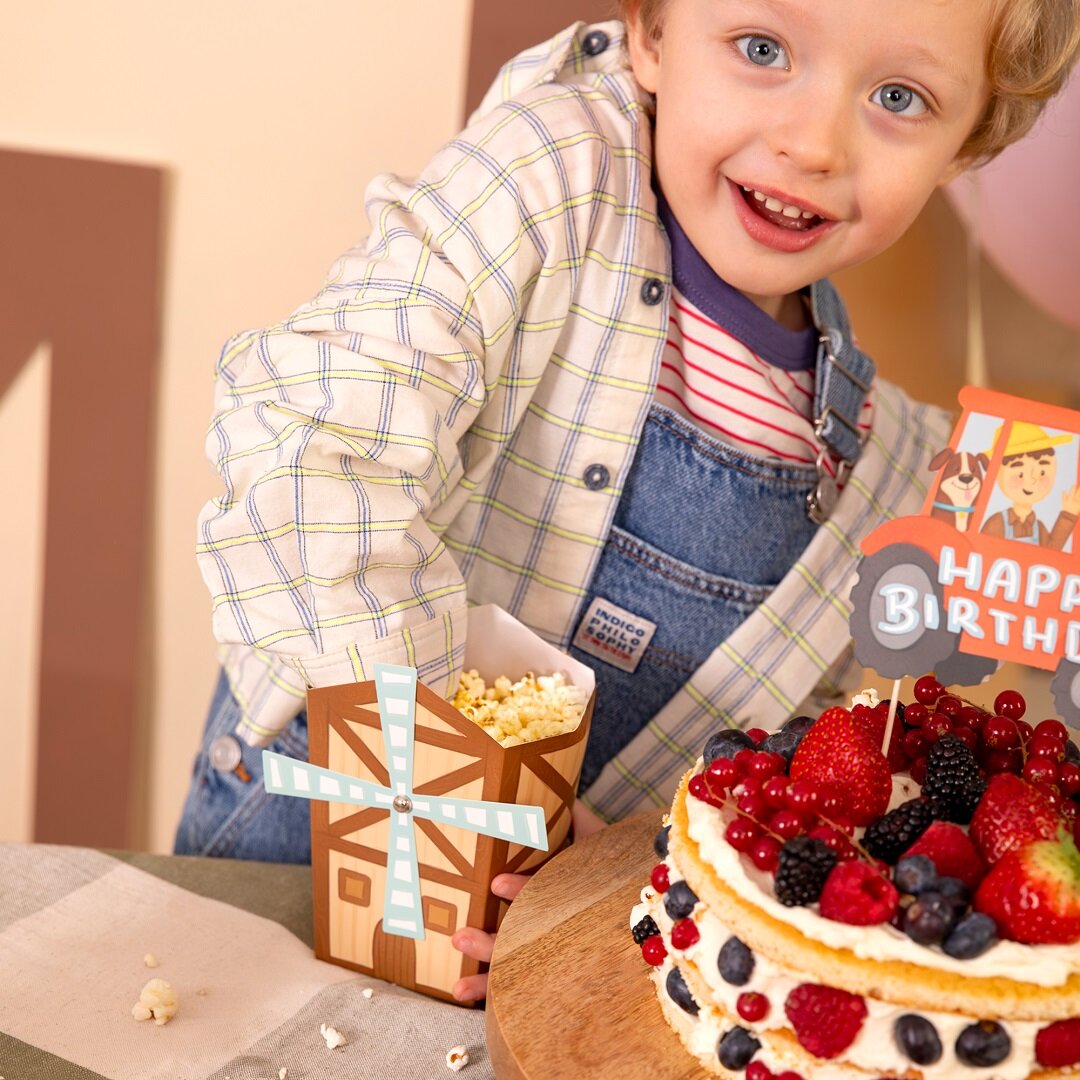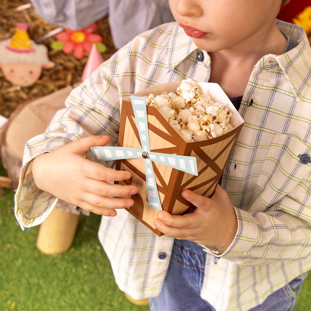 6 popcornbokser i bondegårdstema som blir et lekent og dekorativt innslag på bursdagsbordet. Boksene er formet som små møller og passer perfekt til et bursdagsselskap med bondegårdstema, samtidig som de gjør serveringen ekstra morsom.