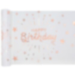 Veldig fin bordløper i hvit med et vakkert motiv av teksten "Happy Birthday" og stjerner i rosegullfolie.