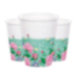8 stk. hvite og mintgrønne kopper av papp med et fargeglad blomstermotiv. Koppene er ca. 10 cm høye og rommer ca. 266 ml.