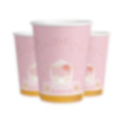 8 stk. pappkopper med motiv av prinsessevogner med gullfolierte detaljer på en lyserosa bakgrunn fra temaet Princess for a Day. Koppene er ca. 9 cm høye og rommer ca. 250 ml.