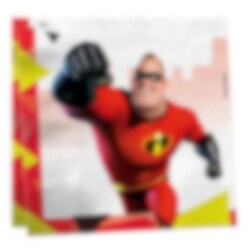 20 stk. kule servietter med fargerikt motiv fra filmen De Utrolige 2. Serviettene måler ca 33 x 33 cm utbrettet.