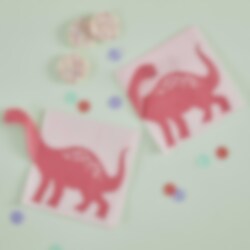 16 stk. små servietter i lys rosa farge med motiver av en mørk rosa dinosaur hvor du kan brette ut hodet for en morsom effekt. Et fint supplement til borddekkingen til festen med rosa dinosaur-tema. Serviettene er 2-lags og er ca. 25 x 25 cm store utbrettet.