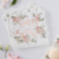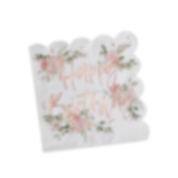 16 stk. fine servietter med søtt motiv av blomster og teksten "Happy Birthday" i roségullfolie på den ene siden. Serviettene er i to lag og er ca. 33 x 33 cm store.