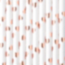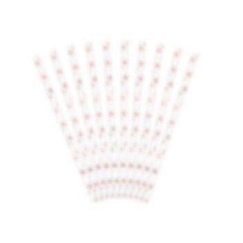 10 fine papirsugerør i hvitt med motiver av søte små rosegullhjerter. Passer utrolig fint som borddekorasjon til babyshoweren eller andre festlige begivenheter. Kan også matches med annet festtilbehør med rosegullfolie. Sugerørene er ca. 19,5 cm høye.