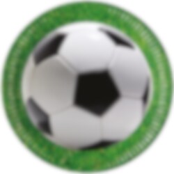 8 stk. tallerkener av papp med kul fotballmotiv. Tallerkene er ca 23 cm i diameter.