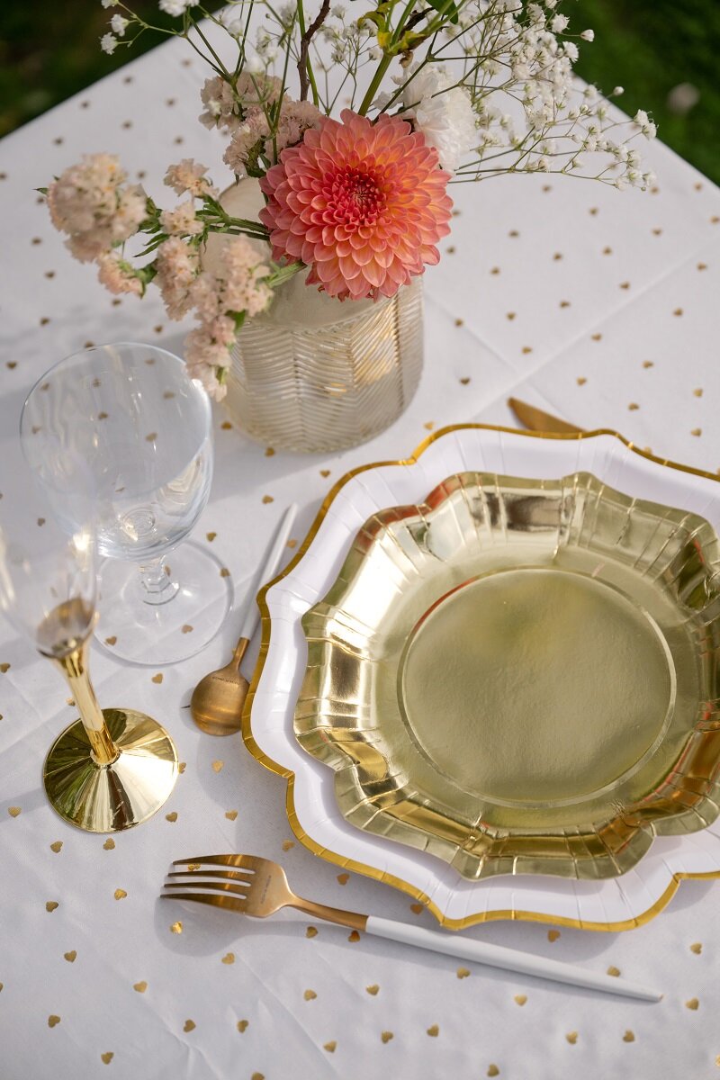 Skap en stilfull borddekking med disse gullfolierte tallerkenene som passer like fint til bursdager, dåp, baby shower, nyttår, bryllup og andre festlige anledninger. Den blanke gullfargen gir borddekkingen en elegant følelse og gjør det enkelt å løfte hele bordet med enkle grep.