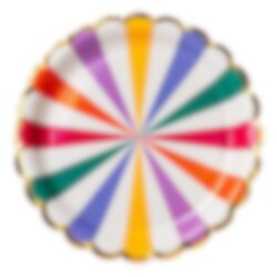 8 stk. tallerkener i vakre farger som er dekorert med gullfolierte kanter. Tallerkenene er 23 cm i diameter og er laget av papp. Inviter vennene dine til en morsom bursdag.