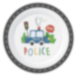 6 stk. papptallerkener med morsomt motiv av en politibil. Tallerkenene er 22 cm i diameter.