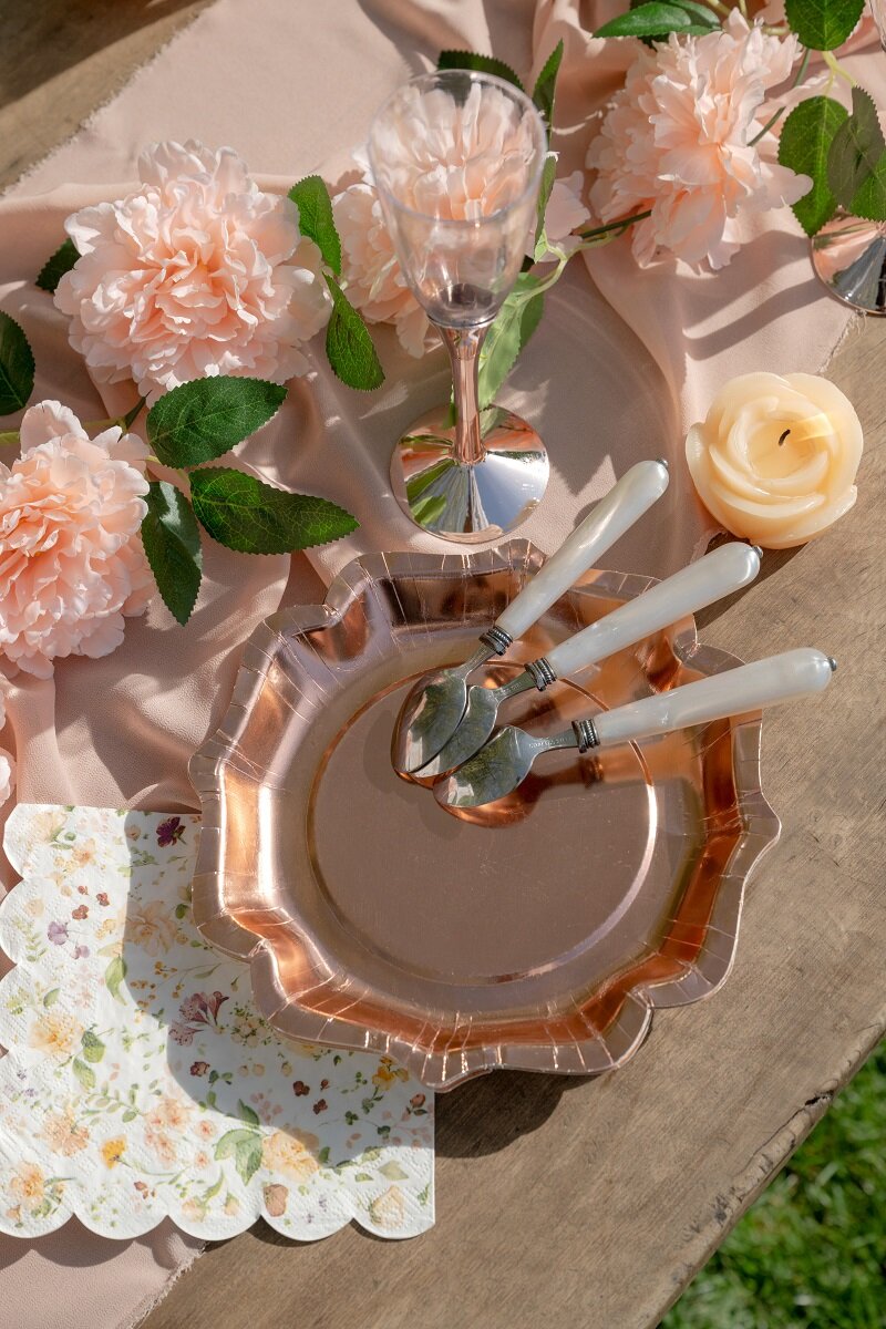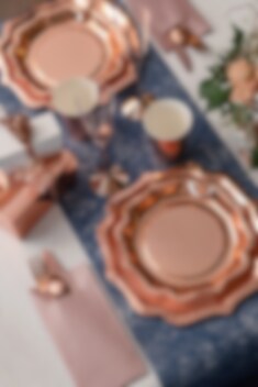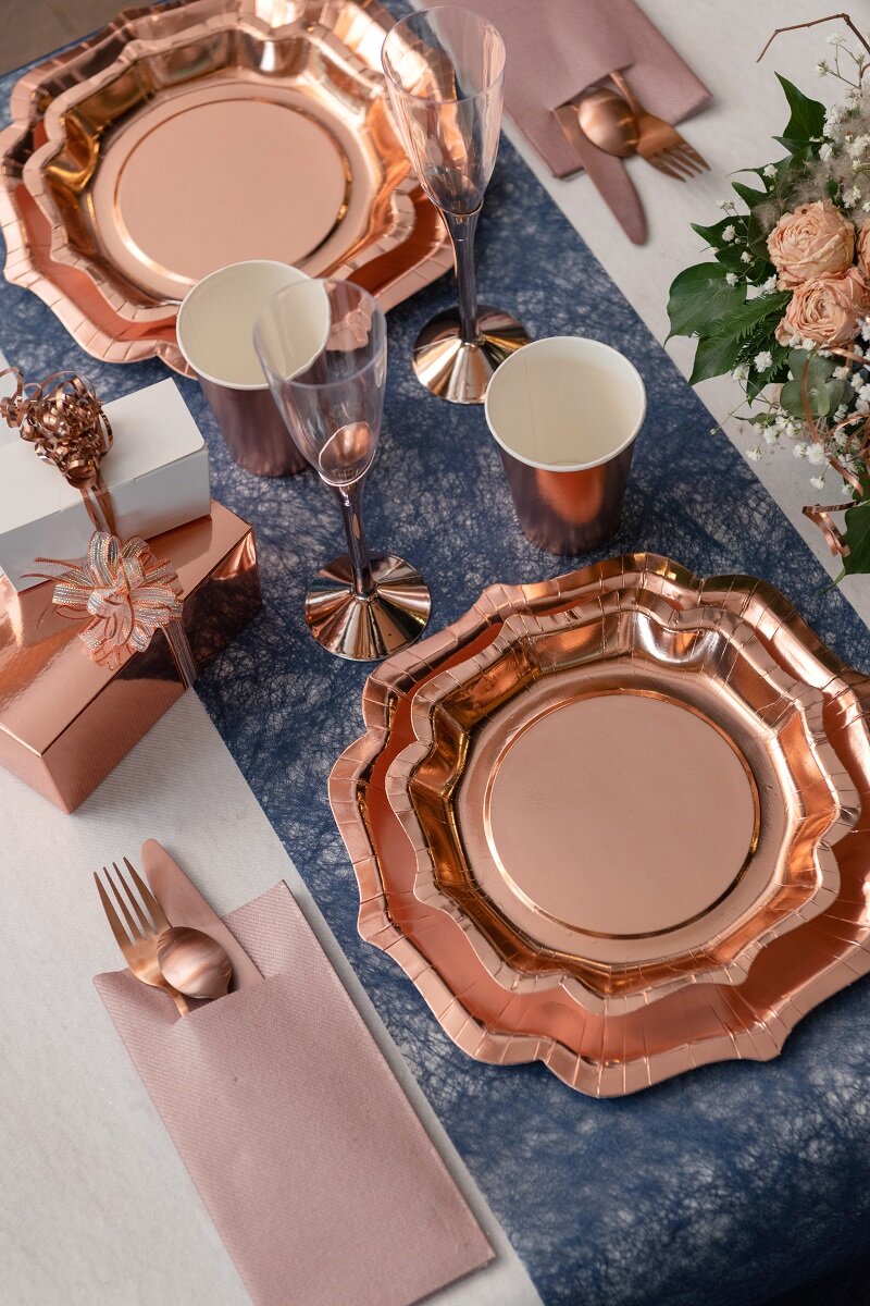 Skap en stilfull borddekking med disse roségullfolierte tallerkenene som passer like fint til bursdager, dåp, baby shower, nyttår, bryllup og andre festlige anledninger. Den blanke roségullfargen gir borddekkingen en elegant følelse og gjør det enkelt å gi hele bordet et løft med enkle midler.
