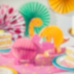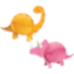 2 stk. borddekorasjoner av honeycomb som forestiller en triceratops og en brontosaurus i fargene rosa og gul. Fine dekorasjoner å ha på bordet til festen med dinosaurtema. Dekorasjonene er ca. 18 x 5 cm og 23 x 19 cm store.