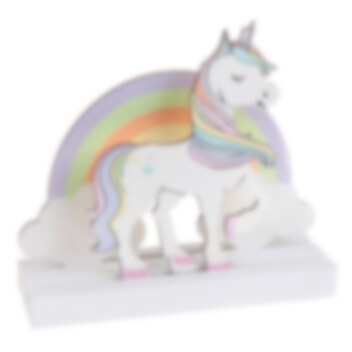 Utrolig fin borddekorasjon i tre med motiv av en enhjørning og pastellfarget regnbue. Perfekt til å dekorere bordet med til festen eller hvorfor ikke ha som dekorasjon på rommet ditt.