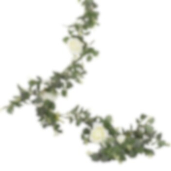 Skap en elegant og romantisk atmosfære med denne vakre girlanderen. Girlanderen er formet som eukalyptusgrener dekorert med delikate hvite roser, perfekt for bryllup, fester og andre spesielle anledninger.